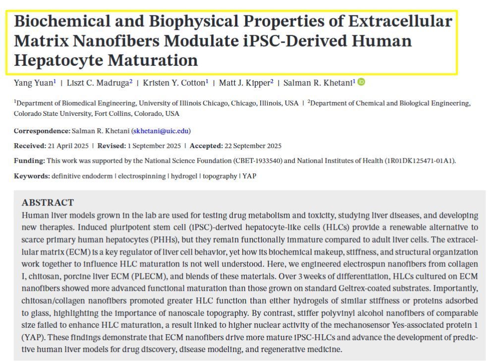 Our latest study addresses a critical challenge in liver tissue engineering: stem cell-derived liver cells (iHeps) typically remain functionally immature, limiting their usefulness for drug testing and disease modeling. Our research team created 3D microtissues using droplet microfluidics technology by: • Encapsulating iHeps in tiny collagen gel droplets (~250 μm diameter) • Coating these structures with various non-parenchymal cells (NPCs) • Testing different combinations and sequences of supporting cells Key findings: 1) Embryonic fibroblasts and liver sinusoidal endothelial cells (LSECs) produced the most mature iHeps compared to other tested cell types 2) Sequential application of cell signals (embryonic fibroblasts first, then LSECs) yielded optimal maturation 3) Specific growth factors like stromal-derived factor-1 alpha were identified as important maturation enhancers 4) Gene expression analysis confirmed that LSEC/iHep microtissues closely resembled adult human liver cells This platform enables researchers to identify critical cellular interactions and molecular signals that drive liver cell maturation, providing valuable insights for developing more physiologically relevant liver models for drug screening and regenerative medicine applications. https://www.sciencedirect.com/science/article/pii/S174270612500193X SIMPLE SUMMARY: Embryonic fibroblasts and liver sinusoidal endothelial cells dramatically improved iHep maturation compared to other cell types tested, producing more functionally mature liver cells. Sequential application proved crucial—adding embryonic fibroblasts first, followed by endothelial cells, yielded optimal maturation. Specific growth factors including stromal-derived factor-1 enhanced this process. This research enables creation of more authentic mini-liver tissues that function like human liver. These improved models support better drug testing, disease research, and regenerative medicine applications.